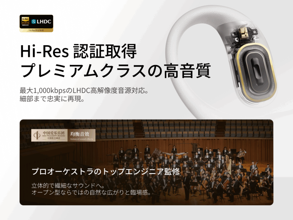 | その他 | コンパクトで高級感のあるデザイン。充電ケース込みで最大53時間の長時間バッテリー。 | オープンタイプのため、大音量での使用は音漏れが完全に防げない。高性能オーディオコーデック「LHDC」対応機種が限られる。 |