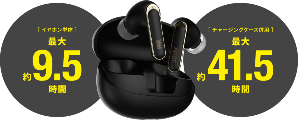 - スタミナ:イヤホン単体で最大9.5時間、ケース併用で最大41.5時間というロングバッテリー。